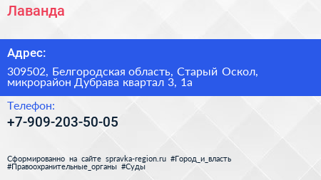 Лаванда по адресу 309502, Белгородская область, Старый Оскол, микрорайон Дубрава квартал 3, 1а в дальнейшем Организация, размещена в следующих категориях: