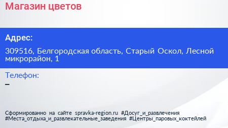 Магазин цветов по адресу 309516, Белгородская область, Старый Оскол, Лесной микрорайон, 1 в дальнейшем Организация, размещена в следующих категориях: