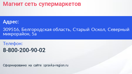 Магнит, сеть супермаркетов по адресу 309516, Белгородская область, Старый Оскол, Северный микрорайон, 5а в дальнейшем Организация, размещена в следующих категориях: