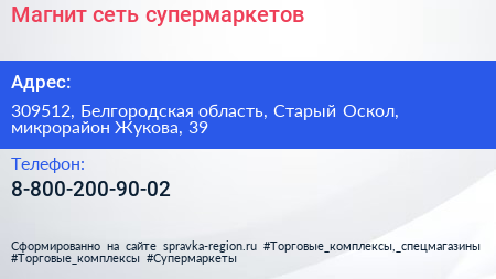 Магнит, сеть супермаркетов по адресу 309512, Белгородская область, Старый Оскол, микрорайон Жукова, 39 в дальнейшем Организация, размещена в следующих категориях: