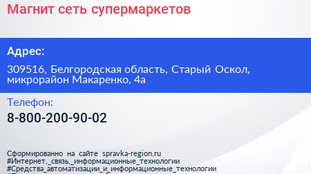 Магнит, сеть супермаркетов по адресу 309516, Белгородская область, Старый Оскол, микрорайон Макаренко, 4а в дальнейшем Организация, размещена в следующих категориях:
