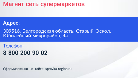 Магнит, сеть супермаркетов по адресу 309516, Белгородская область, Старый Оскол, Юбилейный микрорайон, 4а в дальнейшем Организация, размещена в следующих категориях:
