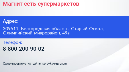 Магнит, сеть супермаркетов по адресу 309511, Белгородская область, Старый Оскол, Олимпийский микрорайон, 49а в дальнейшем Организация, размещена в следующих категориях: