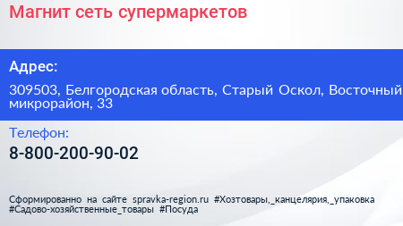 Магнит, сеть супермаркетов по адресу 309503, Белгородская область, Старый Оскол, Восточный микрорайон, 33 в дальнейшем Организация, размещена в следующих категориях: