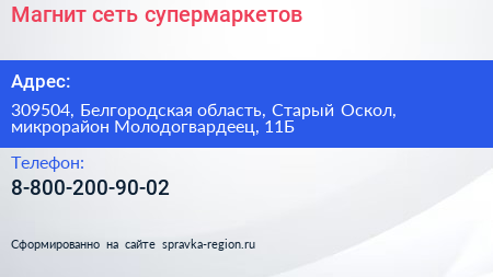 Магнит, сеть супермаркетов по адресу 309504, Белгородская область, Старый Оскол, микрорайон Молодогвардеец, 11Б в дальнейшем Организация, размещена в следующих категориях: