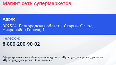 Магнит, сеть супермаркетов по адресу 309504, Белгородская область, Старый Оскол, микрорайон Горняк, 1 в дальнейшем Организация, размещена в следующих категориях: