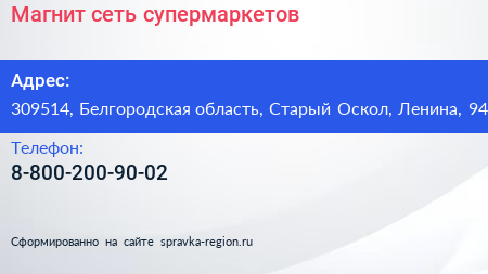 Магнит, сеть супермаркетов по адресу 309514, Белгородская область, Старый Оскол, Ленина, 94 в дальнейшем Организация, размещена в следующих категориях: