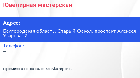 Ювелирная мастерская по адресу Белгородская область, Старый Оскол, проспект Алексея Угарова, 2 в дальнейшем Организация, размещена в следующих категориях: