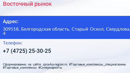 Восточный, рынок по адресу 309518, Белгородская область, Старый Оскол, Свердлова, 4 в дальнейшем Организация, размещена в следующих категориях: