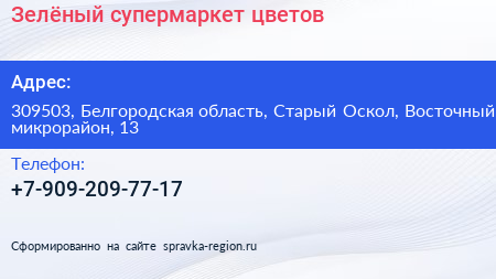 Зелёный, супермаркет цветов по адресу 309503, Белгородская область, Старый Оскол, Восточный микрорайон, 13 в дальнейшем Организация, размещена в следующих категориях: