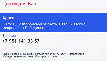 Цветы для Вас по адресу 309510, Белгородская область, Старый Оскол, микрорайон Лебединец, 1 в дальнейшем Организация, размещена в следующих категориях: