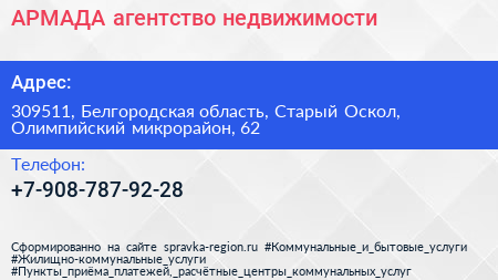 АРМАДА, агентство недвижимости по адресу 309511, Белгородская область, Старый Оскол, Олимпийский микрорайон, 62 в дальнейшем Организация, размещена в следующих категориях: