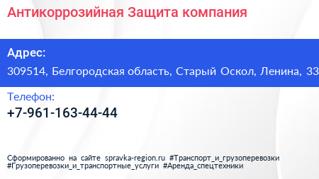 Антикоррозийная Защита, компания по адресу 309514, Белгородская область, Старый Оскол, Ленина, 33 в дальнейшем Организация, размещена в следующих категориях: