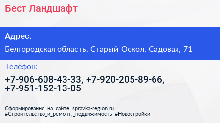 Бест Ландшафт по адресу Белгородская область, Старый Оскол, Садовая, 71 в дальнейшем Организация, размещена в следующих категориях: