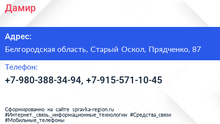 Дамир по адресу Белгородская область, Старый Оскол, Прядченко, 87 в дальнейшем Организация, размещена в следующих категориях: