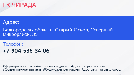 ГК ЧИРАДА по адресу Белгородская область, Старый Оскол, Северный микрорайон, 35 в дальнейшем Организация, размещена в следующих категориях: