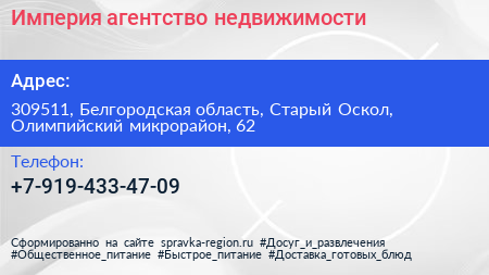 Империя, агентство недвижимости по адресу 309511, Белгородская область, Старый Оскол, Олимпийский микрорайон, 62 в дальнейшем Организация, размещена в следующих категориях: