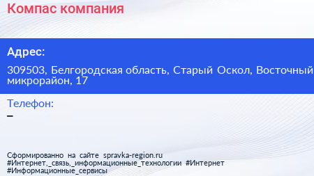 Компас, компания по адресу 309503, Белгородская область, Старый Оскол, Восточный микрорайон, 17 в дальнейшем Организация, размещена в следующих категориях: