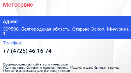 Метсервис по адресу 309508, Белгородская область, Старый Оскол, Мичурина, 1 в дальнейшем Организация, размещена в следующих категориях: