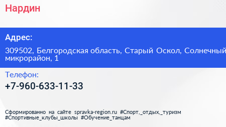 Нардин по адресу 309502, Белгородская область, Старый Оскол, Солнечный микрорайон, 1 в дальнейшем Организация, размещена в следующих категориях: