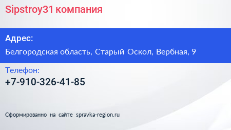 Sipstroy31, компания по адресу Белгородская область, Старый Оскол, Вербная, 9 в дальнейшем Организация, размещена в следующих категориях: