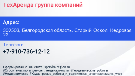 ТехАренда, группа компаний по адресу 309503, Белгородская область, Старый Оскол, Кедровая, 22 в дальнейшем Организация, размещена в следующих категориях: