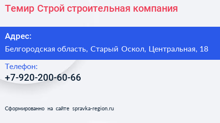 Темир-Строй, строительная компания по адресу Белгородская область, Старый Оскол, Центральная, 18 в дальнейшем Организация, размещена в следующих категориях: