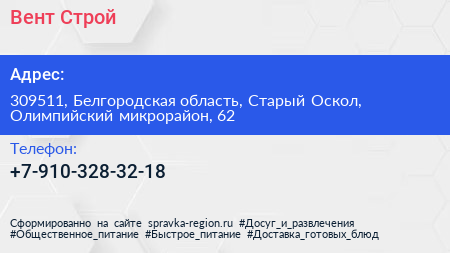 Вент-Строй по адресу 309511, Белгородская область, Старый Оскол, Олимпийский микрорайон, 62 в дальнейшем Организация, размещена в следующих категориях: