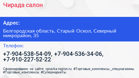 Чирада, салон по адресу Белгородская область, Старый Оскол, Северный микрорайон, 35 в дальнейшем Организация, размещена в следующих категориях: