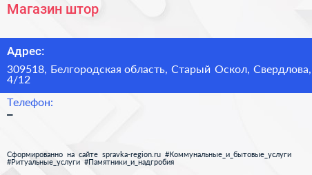 Магазин штор по адресу 309518, Белгородская область, Старый Оскол, Свердлова, 4/12 в дальнейшем Организация, размещена в следующих категориях: