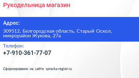 Рукодельница, магазин по адресу 309512, Белгородская область, Старый Оскол, микрорайон Жукова, 27а в дальнейшем Организация, размещена в следующих категориях: