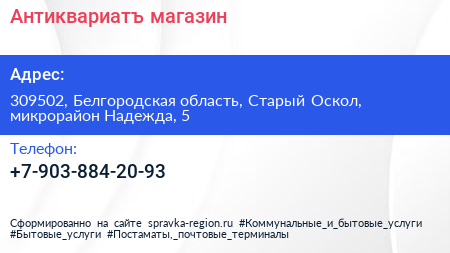 Антиквариатъ, магазин по адресу 309502, Белгородская область, Старый Оскол, микрорайон Надежда, 5 в дальнейшем Организация, размещена в следующих категориях: