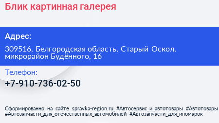 Блик, картинная галерея по адресу 309516, Белгородская область, Старый Оскол, микрорайон Будённого, 16 в дальнейшем Организация, размещена в следующих категориях: