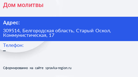 Дом молитвы по адресу 309514, Белгородская область, Старый Оскол, Коммунистическая, 17 в дальнейшем Организация, размещена в следующих категориях: