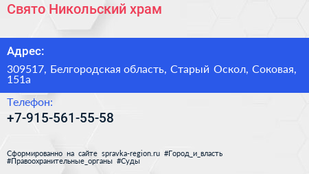 Свято-Никольский храм по адресу 309517, Белгородская область, Старый Оскол, Соковая, 151а в дальнейшем Организация, размещена в следующих категориях:
