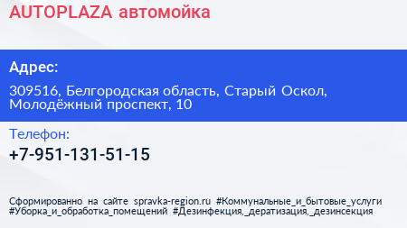 AUTOPLAZA, автомойка по адресу 309516, Белгородская область, Старый Оскол, Молодёжный проспект, 10 в дальнейшем Организация, размещена в следующих категориях: