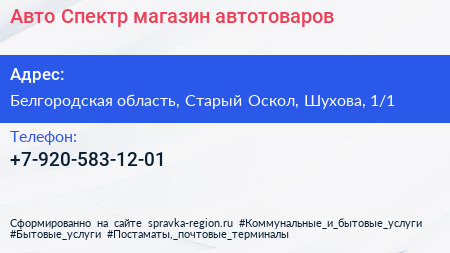 Авто-Спектр, магазин автотоваров по адресу Белгородская область, Старый Оскол, Шухова, 1/1 в дальнейшем Организация, размещена в следующих категориях: