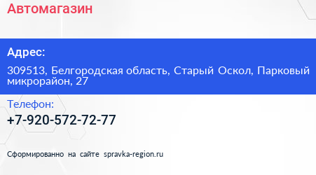 Автомагазин по адресу 309513, Белгородская область, Старый Оскол, Парковый микрорайон, 27 в дальнейшем Организация, размещена в следующих категориях: