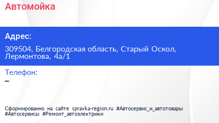 Автомойка по адресу 309504, Белгородская область, Старый Оскол, Лермонтова, 4а/1 в дальнейшем Организация, размещена в следующих категориях: