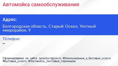 Автомойка самообслуживания по адресу Белгородская область, Старый Оскол, Уютный микрорайон, 9 в дальнейшем Организация, размещена в следующих категориях: