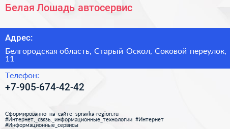 Белая Лошадь, автосервис по адресу Белгородская область, Старый Оскол, Соковой переулок, 11 в дальнейшем Организация, размещена в следующих категориях: