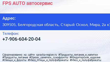 FPS AUTO, автосервис по адресу 309505, Белгородская область, Старый Оскол, Мира, 2а к1 в дальнейшем Организация, размещена в следующих категориях: