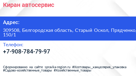 Киран, автосервис по адресу 309508, Белгородская область, Старый Оскол, Прядченко, 150/1 в дальнейшем Организация, размещена в следующих категориях: