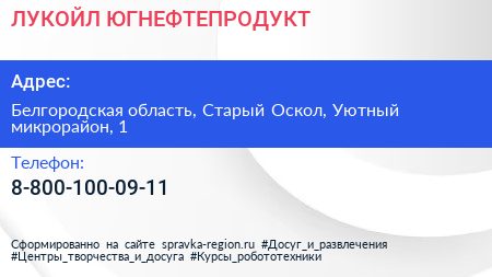 ЛУКОЙЛ-ЮГНЕФТЕПРОДУКТ по адресу Белгородская область, Старый Оскол, Уютный микрорайон, 1 в дальнейшем Организация, размещена в следующих категориях:
