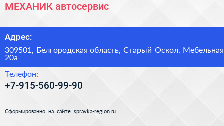 МЕХАНИК, автосервис по адресу 309501, Белгородская область, Старый Оскол, Мебельная, 20а в дальнейшем Организация, размещена в следующих категориях: