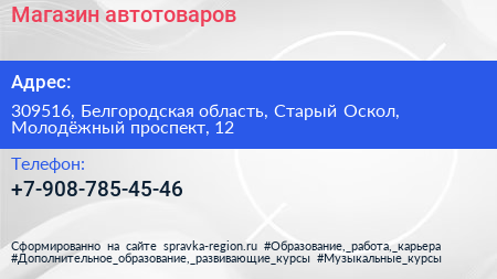Магазин автотоваров по адресу 309516, Белгородская область, Старый Оскол, Молодёжный проспект, 12 в дальнейшем Организация, размещена в следующих категориях: