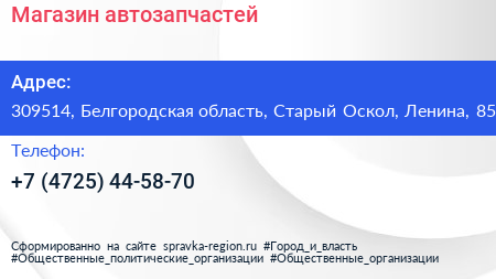 Магазин автозапчастей по адресу 309514, Белгородская область, Старый Оскол, Ленина, 85 в дальнейшем Организация, размещена в следующих категориях: