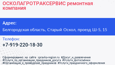 ОСКОЛАГРОТРАКСЕРВИС, ремонтная компания по адресу Белгородская область, Старый Оскол, проезд Ш-5, 15 в дальнейшем Организация, размещена в следующих категориях: