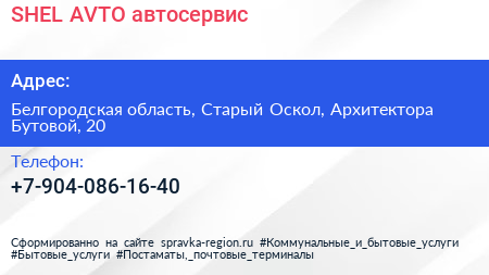 SHEL AVTO, автосервис по адресу Белгородская область, Старый Оскол, Архитектора Бутовой, 20 в дальнейшем Организация, размещена в следующих категориях: