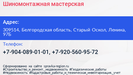 Шиномонтажная мастерская по адресу 309514, Белгородская область, Старый Оскол, Ленина, 97Б в дальнейшем Организация, размещена в следующих категориях: